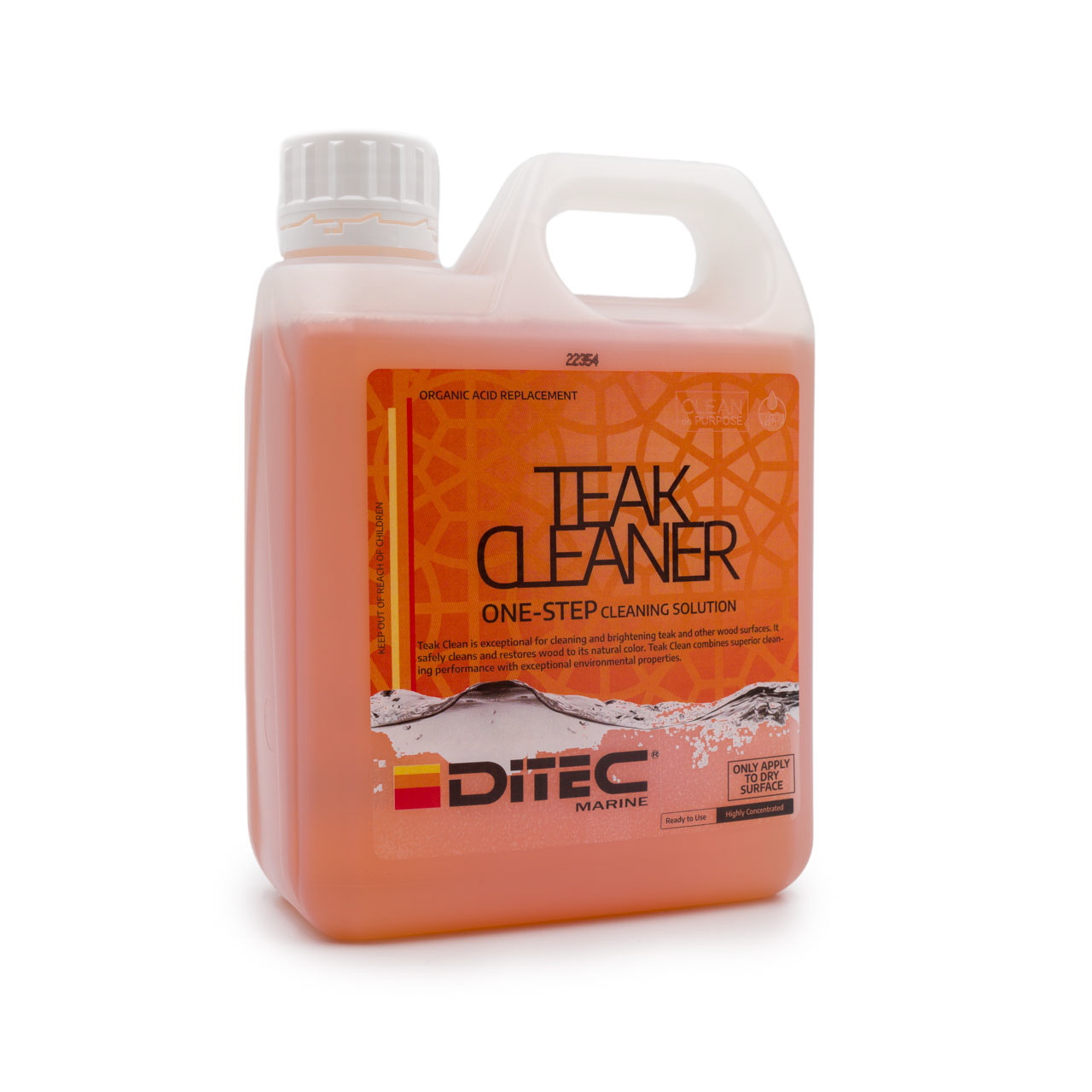 TEAK CLEAN er et trygt og effektivt, ikke-giftig, organisk og miljøvennlig alternativ til bruk av fosforsyre eller andre kaustiske rengjøringsmidler. Det er spesielt utviklet for teak og andre treoverflater og rengjør og gjenoppretter teakdekk og tre møbler til deres naturlige farge på en trygg måte. Teak Clean kombinerer ultra-lav pH-verdi og overlegen rengjøringsytelse med enestående miljøegenskaper. Dette produktet kan trygt utslippes i elver, bekker, hav og andre vannveier når det brukes som anvist. Flere detaljer: En-trinns rengjøringsprosess sparer tid Ikke DOT-regulert; tilbyr lav transportkostnad Lav forbrukshastighet, kostnadseffektivt Fjerner mugg og sopp Inneholder ikke-korrosive inhibitorer for de fleste metaller (ikke for bruk på eller i nærheten av aluminium, messing eller myke og overflatebehandlede metaller) Utseende: Klar væske Løselighet: 100% i vann pH: <1 BRUKSANVISNING: Sørg for å bruke riktig sikkerhetsutstyr, inkludert nitrilhansker. For beste resultat, påfør Ditec Teak Clean på en tørr eller litt fuktig overflate. DYPP IKKE TREVERKET I VANN! Påfør dette produktet ved å helle direkte på dekkoverflaten eller påføre med en kjemikaliebestandig sprayer eller pumpe-sprayer. La Teak Clean suge/dwell på overflaten i 30 sekunder til 5 minutter. Vann kan tilsettes på overflaten på dette tidspunktet. Børst overflaten med en stiv dekkrensebørste eller en polypropylenpad (3M medium blå Doodlebug pad eller lignende) i samme retning som treverket. Inspekter og skyll børsten eller skureputen hyppig for å fjerne innvevde trefibre. Fortsett denne prosessen til det ikke lenger er innvevde trefibre etter skrubbing. Dette vil sikre et høykvalitets resultat. SKYLL dekket grundig rent med ferskvann og gjenta trinn 1-3 hvis det er nødvendig. ADVARSEL: Hvis Teak Clean kommer i kontakt med metall, stein eller delikate overflater, må overflatene vaskes grundig med såpe og vann.