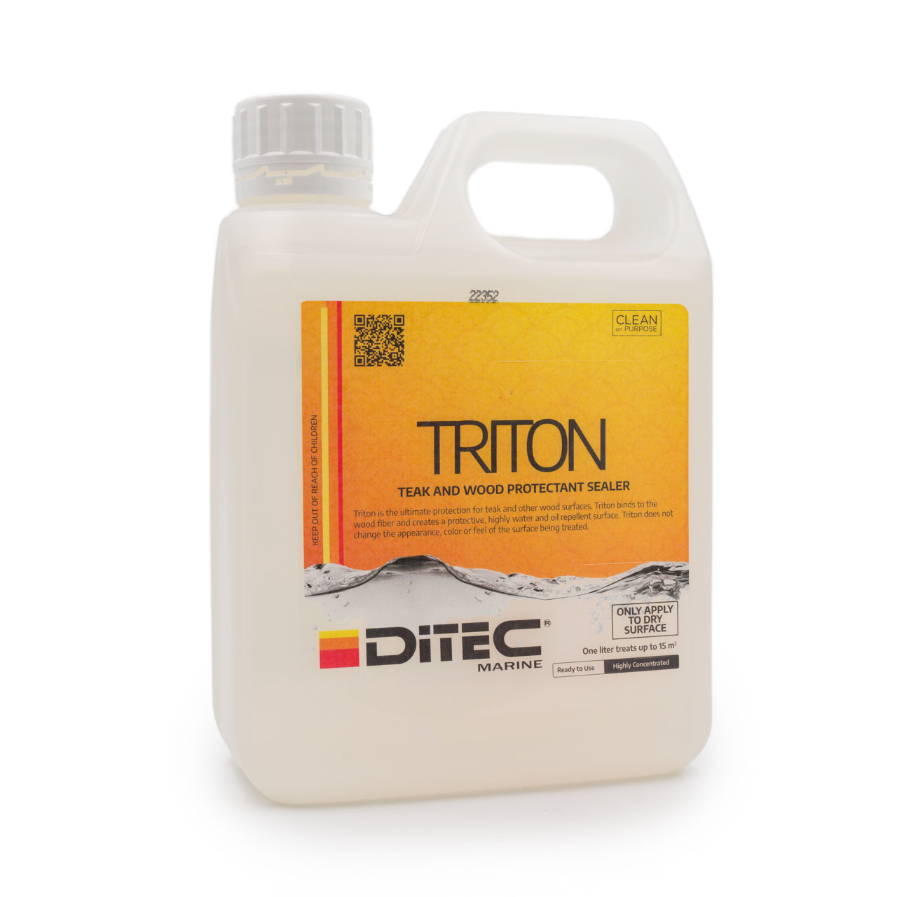 TRITON Teak Shield bruker en ny og forbedret belegging basert på nanoteknologi som er designet for å beskytte teak- og andre treskjæringsflater mot vann, skitt, vin, UV-stråler og mer. TRITON maritim teakbeskyttelse endrer ikke utseendet, fargen eller følelsen til overflaten som behandles og kan bevare teak- eller treflaten i opptil 6 måneder. Flere detaljer En kvart behandler opptil 150 ft2 (14,25 m2) En gallon behandler opptil 600 ft2 (57 m2) Ikke DOT-regulert; tilbyr lav transportkostnad Lav forbrukshastighet, kostnadseffektiv Utseende: Klar væske Løselighet: Ikke vannløselig pH: N / A Anvendelse / Anvisninger DITEC Triton er klar til bruk og skal ikke fortynnes. Rengjør overflaten med DITEC Teak Cleaner i henhold til instruksjonene før påføring av DITEC Triton. Sørg for å bruke riktig sikkerhetsutstyr for å beskytte øyne og hender. Påfør Triton 2.0 på en kjølig, ren og tørr teak- eller treflate. DiTEC Triton kan helles direkte på teak- eller treflaten, påføres med en skumrulle eller klut fra en bøtte, eller påføres fra en trigger sprayer eller håndpumpesprayer. Fordel Triton jevnt på teak- eller treflaten, og sørg for at hele overflaten er jevnt dekket og mettet. Ikke la Triton samle seg opp på overflaten. La en time tørke og påfør et andre strøk. Overflaten er trygg å gå på når Triton er synlig tørr. La Triton 2.0 fullstendig herde i 12 timer før du fukter overflaten. Prøv å unngå å påføre det utendørs hvis det er fare for regn. Hvis det kommer kraftig regn innen 12 timer etter påføring, kan det være nødvendig med et annet lett strøk for maksimal binding. For løpende vedlikehold bør teakdekk vaskes ukentlig med DiTEC Boat Soap og en myk børste. For å holde teakdekket ditt nytt og friskt, rengjør med Teak Clean (avhengig av graden av teakgråning, om noen) i stedet for å vaske med såpe. Bruk en Doodlebug-polypropylenpute i stedet for en dekkrengjøringsbørste og skyll grundig. Påfør Triton-forsegling på nytt. Når du følger et vanlig forebyggende vedlikeholdsprogram for teakdekk, vil sliping av dekkene bare være nødvendig for å fjerne overflatisk skade forårsaket av ulykker og normal slitasjer. Det er viktig å huske på at vedlikehold av teakdekk er en kontinuerlig prosess, og regelmessig rengjøring og beskyttelse er nødvendig for å opprettholde dekkets utseende og beskytte det mot skader. TRITON Teak Shield kan være en nyttig del av et vedlikeholdsprogram for å beskytte teakdekk mot elementene og forlenge levetiden til dekket. Det er også viktig å bruke riktig verneutstyr når du arbeider med DITEC-produkter og følge instruksjonene nøye for å oppnå best mulig resultat og sikkerhet.